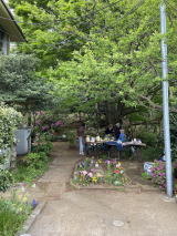 | 西園に下る角に建つ家の庭が賑やかで、オープンガーデンでもしていそうだ。私達もお邪魔してみよう。 |