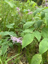 | カタクリの咲く場所は囲いがしてあった。もうすでに実になり、葉もなかった。その代わりピンクのイカリソウが沢山咲いていた。 |