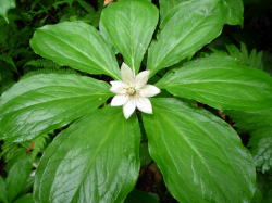 | 登山口には、Sさん待望のキヌガサソウが瑞々しい姿を見せてくれた。 |
