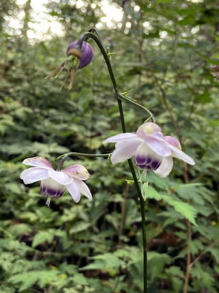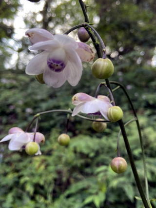 | レンゲショウマは花はもちろん素敵だが、コロンとした蕾が可愛い。花は下を向いて咲くので、斜面がちょうどよい。木漏れ日の中で、斜面一面に咲いていた。 |