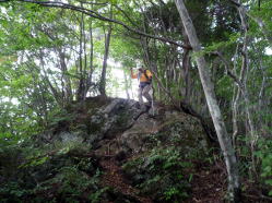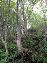 | ここから先は一段と草深くなり、道が隠れてしまうほどのところもある。ブナやクヌギ、カエデなどの落葉樹に覆われた緑の中を歩く。 |