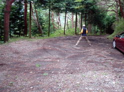 | 養豚場を過ぎてからは、道路脇には小石、小枝、土砂があり、更に道を狭くしている。樹林帯の薄暗い林道を、慎重に車を走らせると、15分くらいで終点だったが、とっても長く感じた。私には、とても運転できない道だった。 |