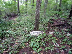 | 登り返したところが、ブドウ岩ノ頭。ピークとは思えない静かな森の中で、壊れた道標が木の根元に置いてあった。 |