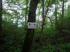 | 何が正しいのか分からないが、山頂の標識に従うことにする。ブナの木についた標識は、木を削り赤鞍ヶ岳と彫ってあり趣がある。 |