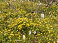 | 木道沿いの日当たりの良いところにはショウジョウバカマ、リュウキンカ、ワタスゲが咲いていた。竜宮手前からはリュウキンカの大群落も見られた。 |