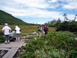 木道を行くと、休憩場所がある。周辺は大小の地塘が点在する。 |