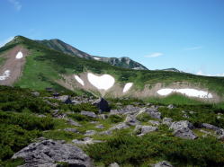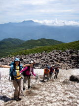 | 今年は雪渓が遅くまで残っているようで、中央にロープがつけられてあった。登りはガッガッと足元を確認しながら登れば、滑ることもなかった。 |