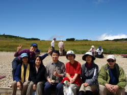 | 眼下に鏡のように静かで、青い白馬大池が見えた。皆、あまりの美しさに、カメラや、携帯で写真を撮りまくった。 |