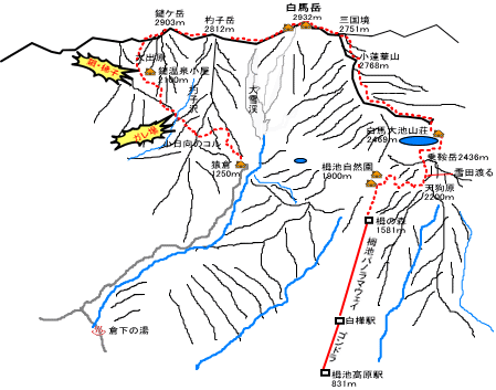 | コースは、栂池より、白馬大池から白馬岳、杓子岳、白馬鑓ヶ岳を経て、白馬鑓温泉へと辿る。大雪渓は、この時期危険が多いとの判断で、このコースに決まった。 |