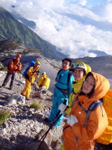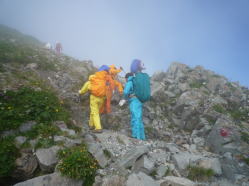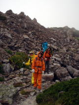 今年、北海道のトムラウシでの大惨事を思い出す。歩いているときはまだいいが、雨風強いと、どんどん体温を奪われる。こんなところに長い間留まったら、低体温症になるのではないかと、身をもって感じた。 |
