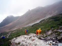 | 少し下った所が、大雪渓の分岐で、まだ多くの人たちが登って来る。 |