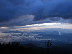 | 山の天気予報はあまり良くない。朝晩小雨、あとは曇り時々晴れ。早朝の気温は5度とかなり寒い。皆、防寒具や雨具を着た。 |