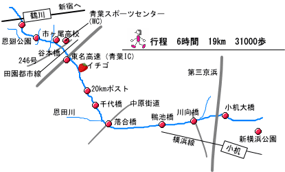 小田急線鶴川駅から、河井田人道橋で鶴見川に出る。 |