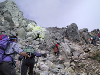 | 足元からは暖かい水蒸気が上り、硫黄で岩が黄色く変色しているところもある。砂礫で滑りやすくなった岩場を、ペンキマークに従い注意しながら登った。 | ||
